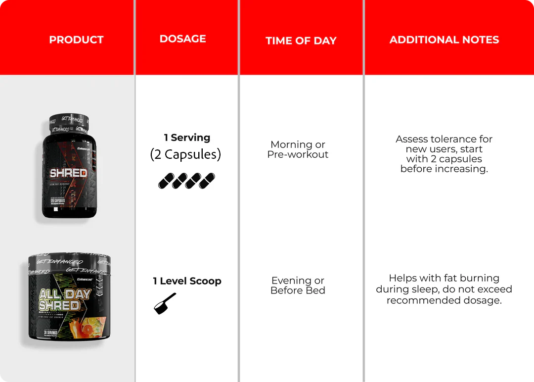 Start your day with SHRED, a powerful energy-boosting formula targeting stubborn fat and fueling your workouts. At night, ALL DAY SHRED takes over with a stimulant-free blend that promotes fat-burning and recovery as you sleep. This 24/7 stack ensures nonstop results—fuel, burn, recover, and redefine your physique effortlessly.