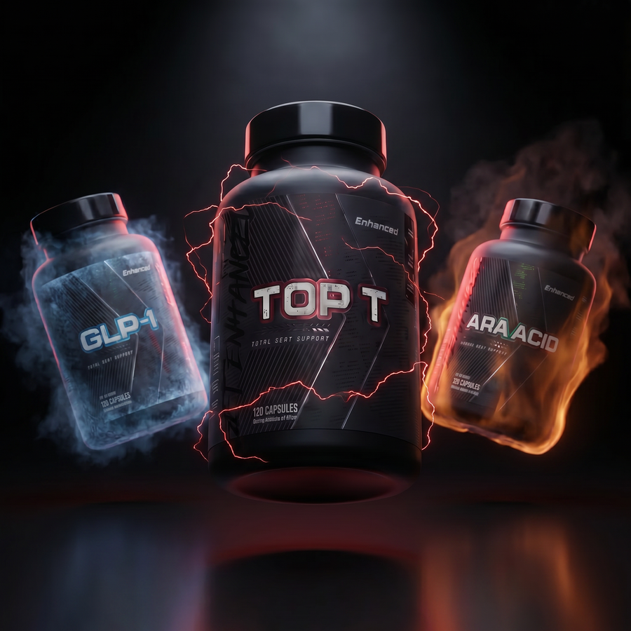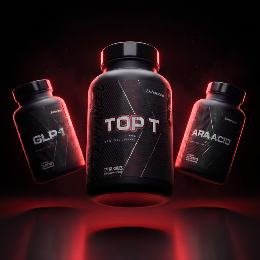 The Testosterone & Performance Stack attacks body composition from three angles — optimising your natural testosterone production, supporting metabolic and appetite control, and priming your muscles for growth through Arachiodonic Acid's anabolic signalling pathway.