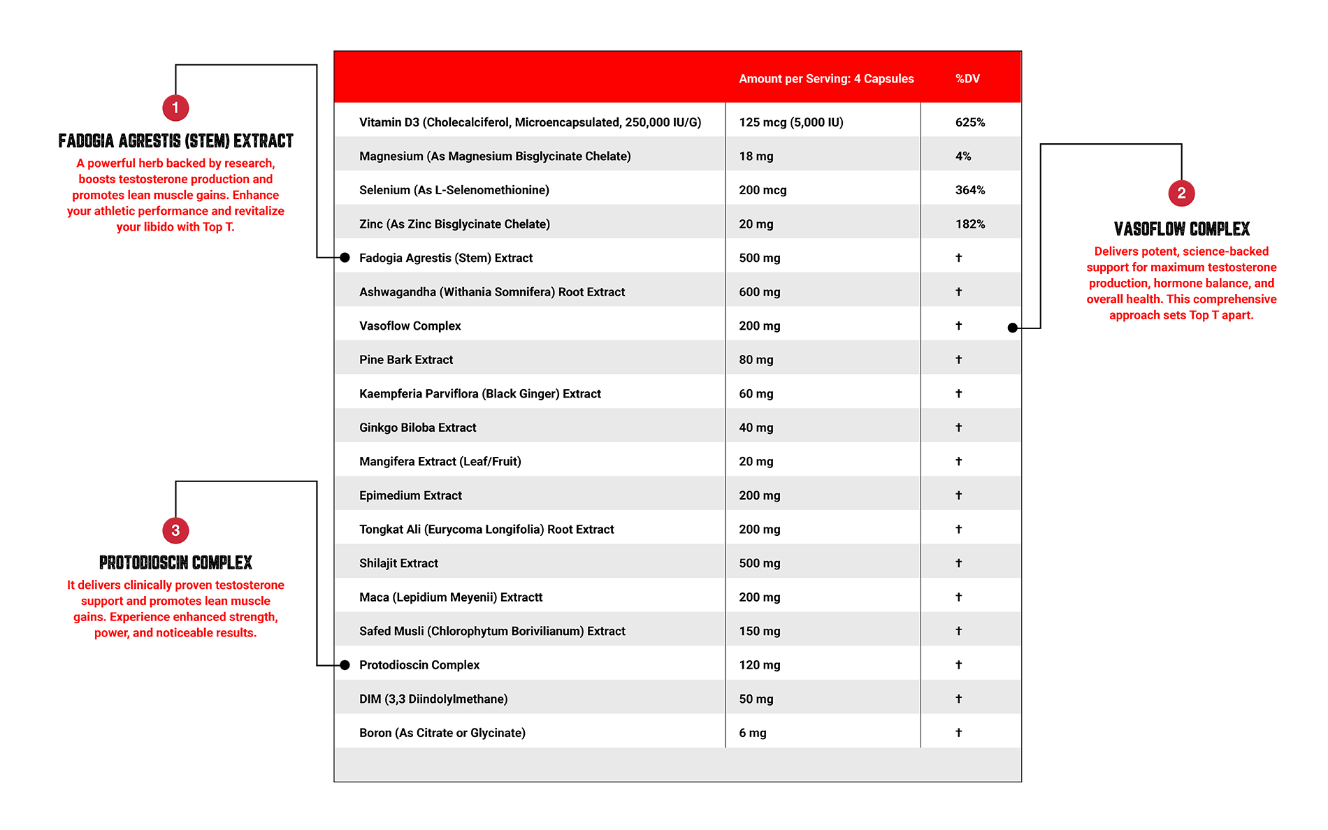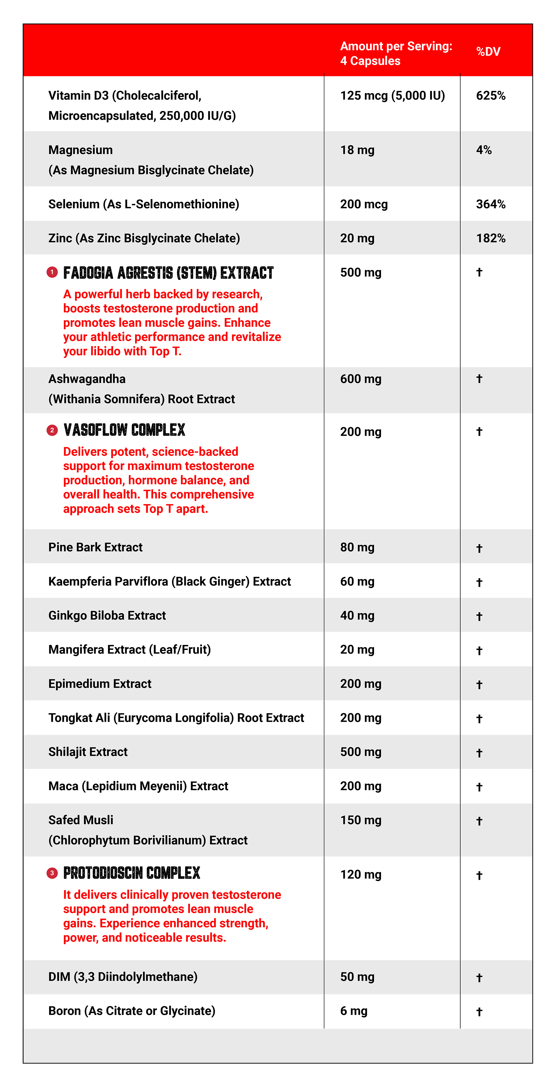 Harness the power of a precision-engineered formula designed to maximize your results. Top T's meticulously selected ingredients, including performance enhancers, work synergistically to unleash your true potential, delivering unmatched testosterone support, optimized hormonal balance, and accelerated muscle growth.